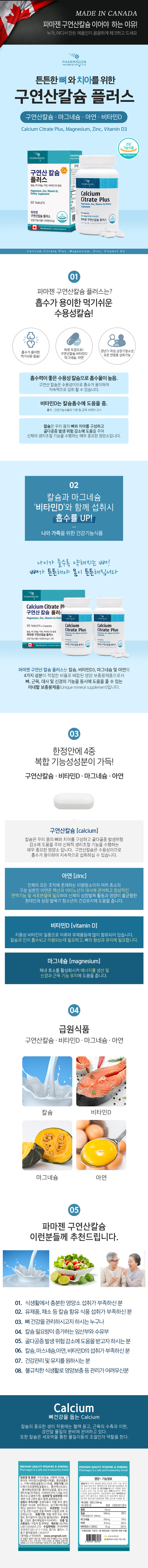 [파마젠]구연산 칼슘 마그네슘 아연 비타민D (1,050mg x 60정) 2개월