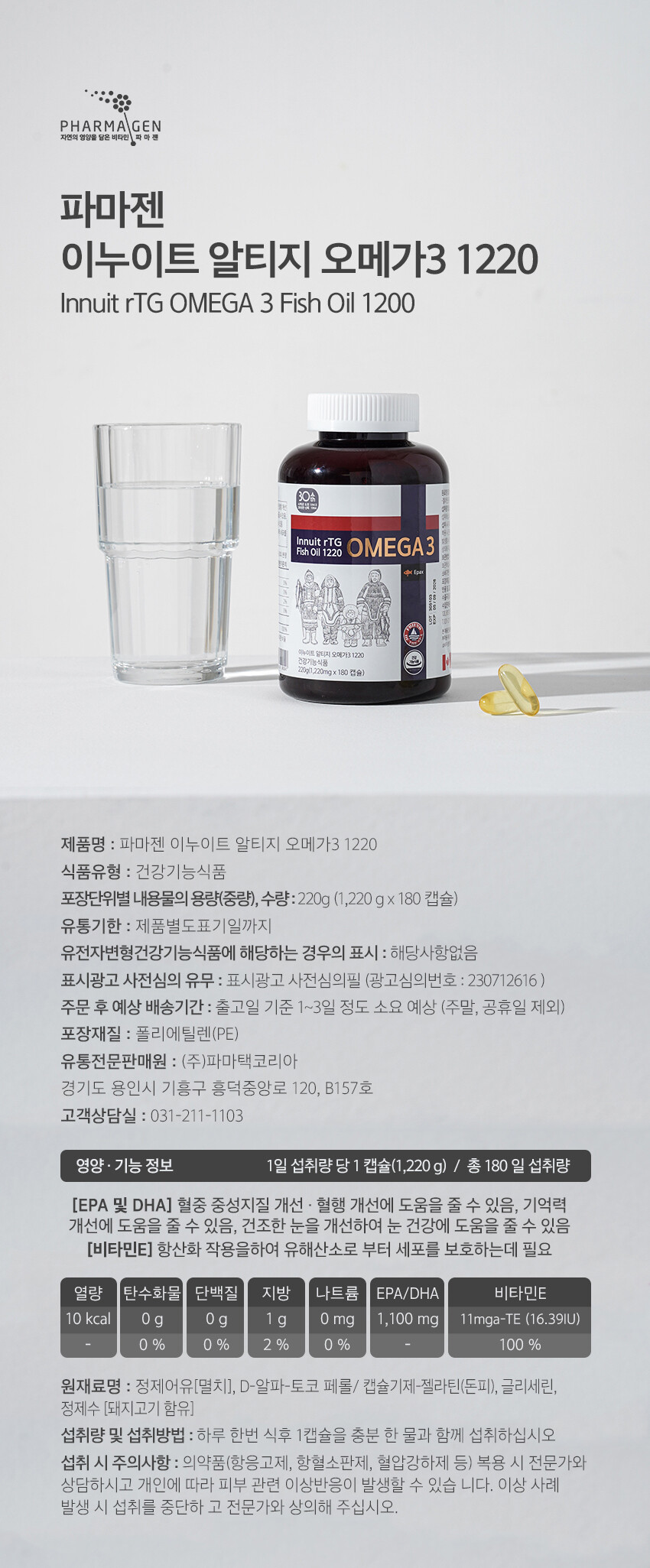 [파마젠]이누이트 알티지 오메가3 (1,220mg x 180캡슐)2통