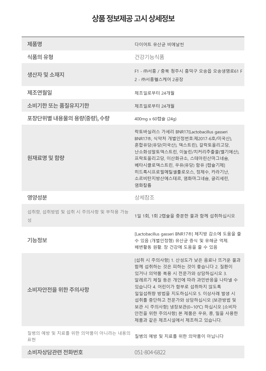 BNR17 비에날씬 다이어트 유산균 400mg 60캡슐 3개
