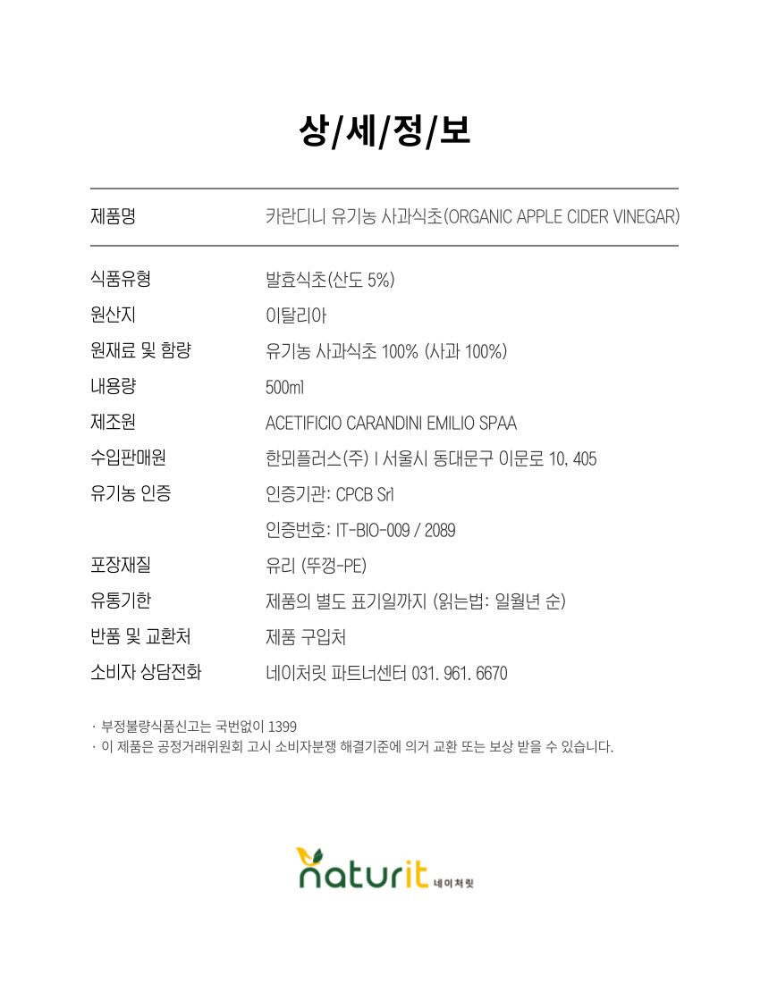 이탈리아 직수입 카란디니 유기농 사과식초 500ml