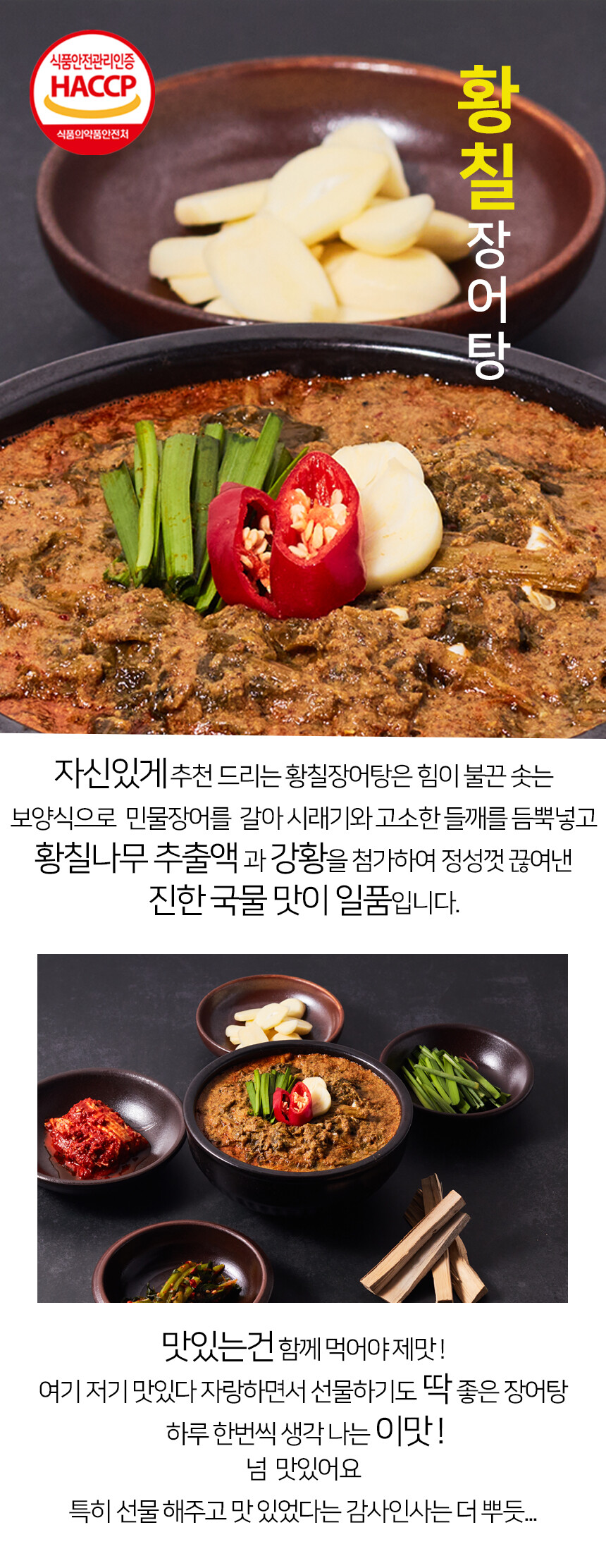 자신있게 추천드리는 황칠 장어탕은 힘이 불끈 솟는 보양식으로 민물장어를 갈아 시래기와 고소한 들깨를 듬뿍넣고 황칠나무추출액과 강황을 첨가하여 정성껏 끓여낸 진한 국물맛이 일품입니다