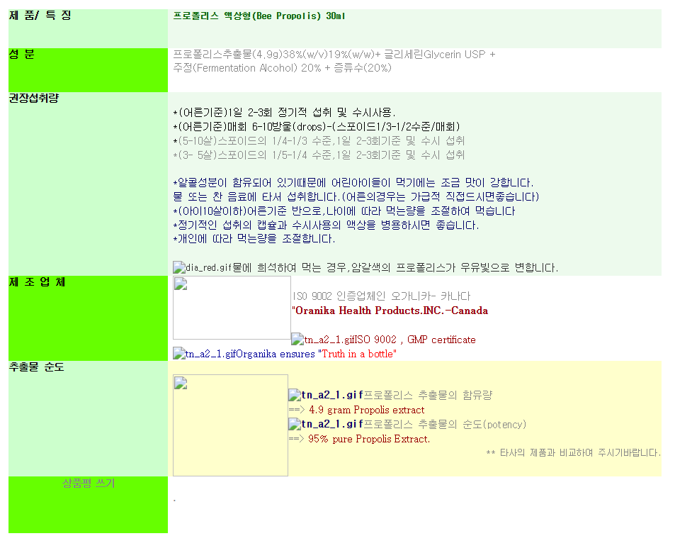제 품/ 특 징 프로폴리스 액상형(Bee Propolis) 30ml 성 분 프로폴리스추출물(4.9g)38%(w/v)19%(w/w)+ 글리세린Glycerin USP + 주정(Fermentation Alcohol) 20% + 증류수(20%) 권장섭취량 *(어른기준)1일 2-3회 정기적 섭취 및 수시사용. *(어른기준)매회 6-10방울(drops)-(스포이드1/3-1/2수준/매회) *(5-10살)스포이드의 1/4-1/3 수준,1일 2-3회기준 및 수시 섭취 *(3- 5살)스포이드의 1/5-1/4 수준,1일 2-3회기준 및 수시 섭취 *알콜성분이 함유되어 있기때문에 어린아이들이 먹기에는 조금 맛이 강합니다. 물 또는 찬 음료에 타서 섭취합니다.(어른의경우는 가급적 직접드시면좋습니다) *(아이10살이하)어른기준 반으로,나이에 따라 먹는량을 조절하여 먹습니다 *정기적인 섭취의 캡슐과 수시사용의 액상을 병용하시면 좋습니다. *개인에 따라 먹는량을 조절합니다. dia_red.gif물에 희석하여 먹는 경우,암갈색의 프로폴리스가 우유빛으로 변합니다. 제 조 업 체 ISO 9002 인증업체인 오가니카- 카나다 "Oranika Health Products.INC.-Canada tn_a2_1.gifISO 9002 , GMP certificate tn_a2_1.gifOrganika ensures "Truth in a bottle" 추출물 순도 tn_a2_1.gif프로폴리스 추출물의 함유량 ==> 4.9 gram Propolis extract tn_a2_1.gif프로폴리스 추출물의 순도(potency) ==> 95% pure Propolis Extract. ** 타사의 제품과 비교하여 주시기바랍니다. 상품평 쓰기 .